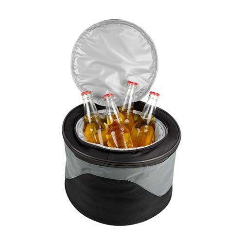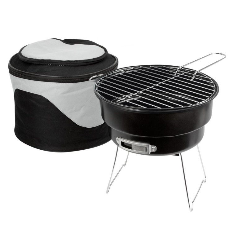 Asador portatil de carbon con hielera. Incluye parrilla con sujetador. Hielera solo en la parte superior. Capacidad para 6 latas. Incluye asa y correa ajustable desprendible.