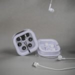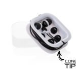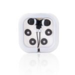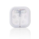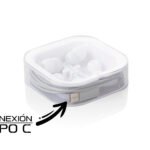 Audífonos con entrada tipo C en estuche cuadrado transparente a presión.