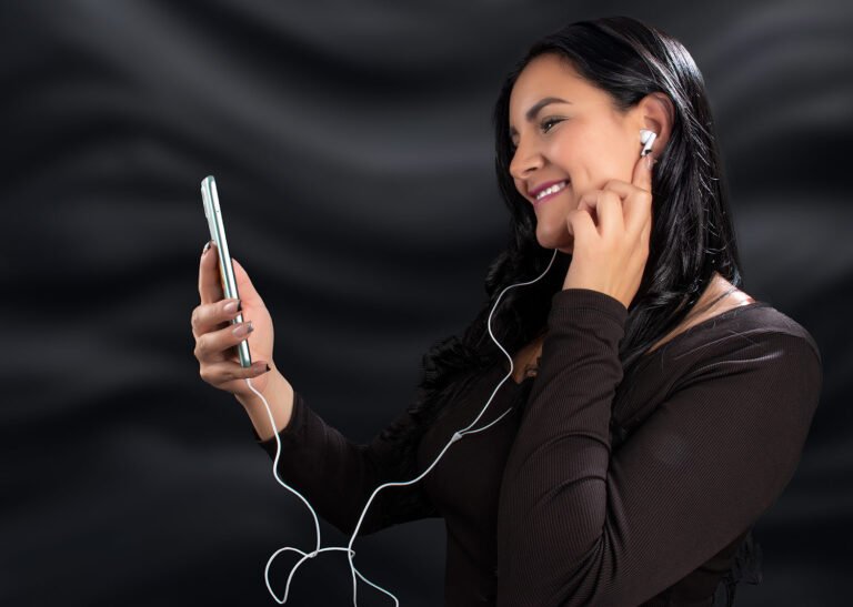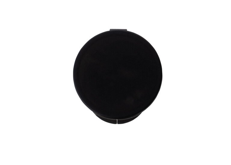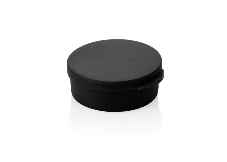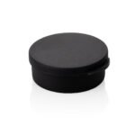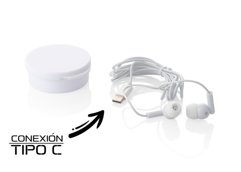 Audífonos con entrada tipo C en estuche circular con tapa a presión.