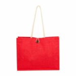 Bolsa con fuelle y asas redondeadas. Interior plastificado. Boton de madera al frente para cerrar.