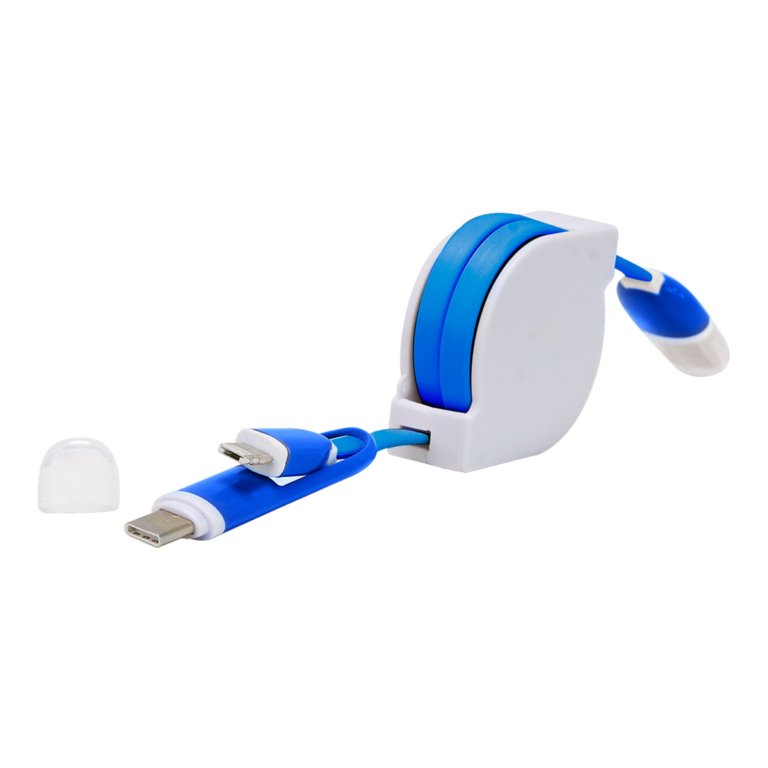 Cable retractil cargador y para transferencia de datos. Compatible con USB, 8 pin, micro USB y entrada tipo C. Longitud de cable 1 m aproximadamente. Incluye protectores para los conectores.