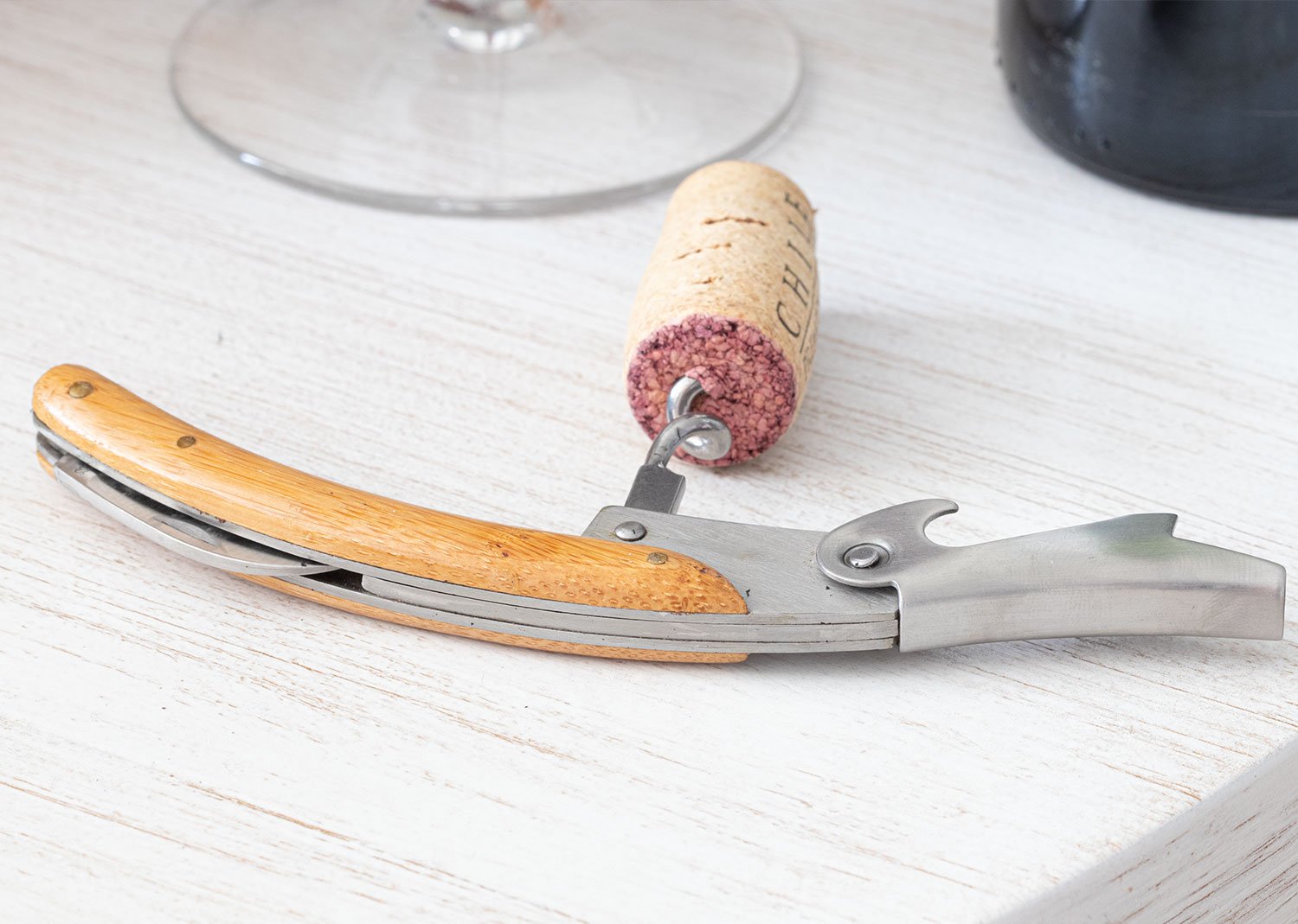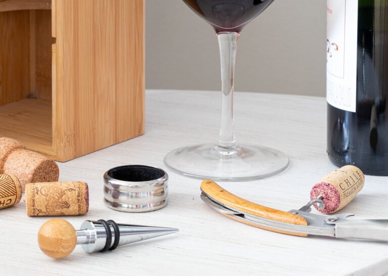 Contiene: 4 accesorios de bar con aplique en madera: Sacacorchos descapsulador de 1 tiempo, cortagotas, tapón metálico y aro antigoteo. NO INCLUYE LA BOTELLA DE VINO.