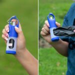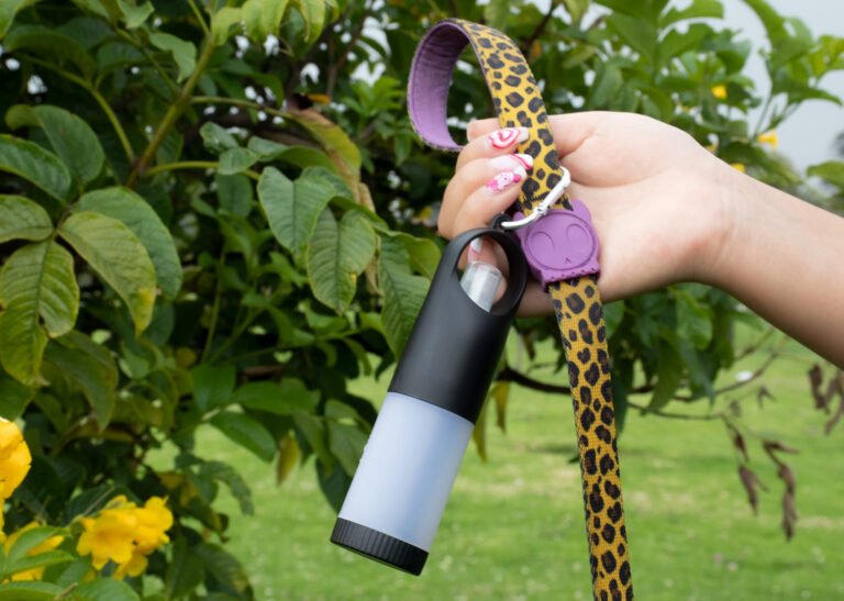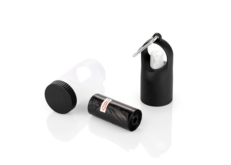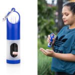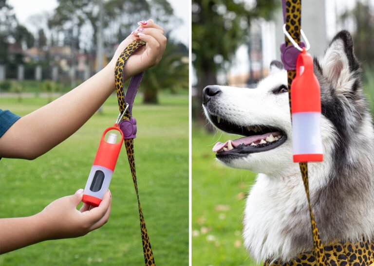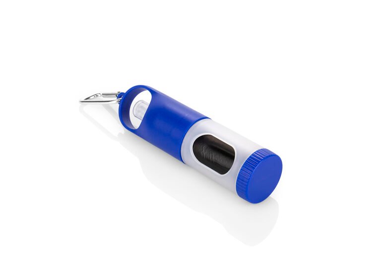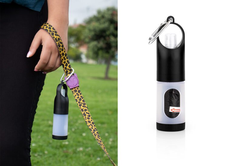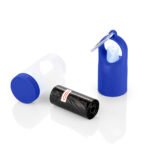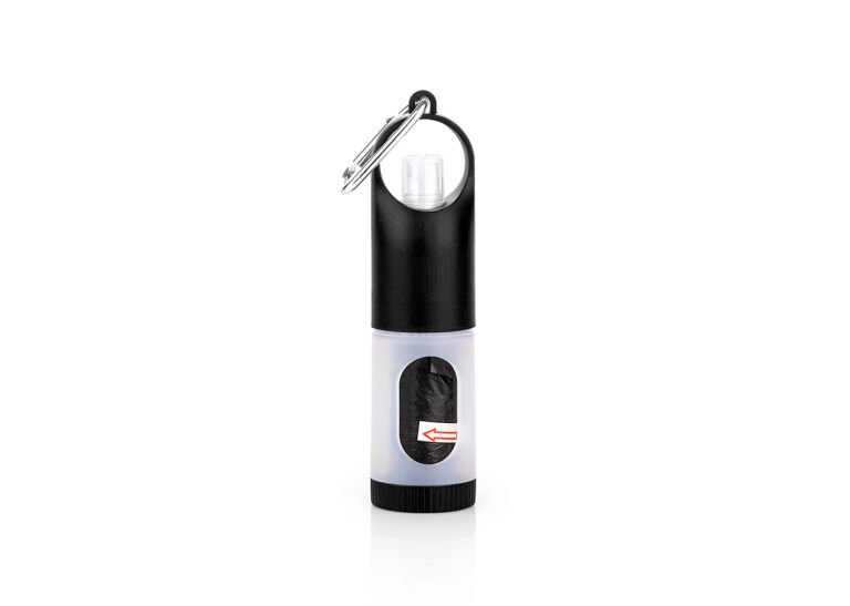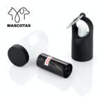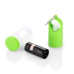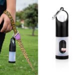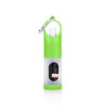 Dispensador de bolsas para mascota. Con gancho carabinero y 15 bolsas incluidas. Frasco para recargar líquidos como gel o alcohol (no incluidos)