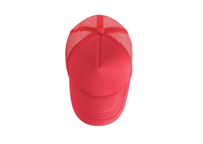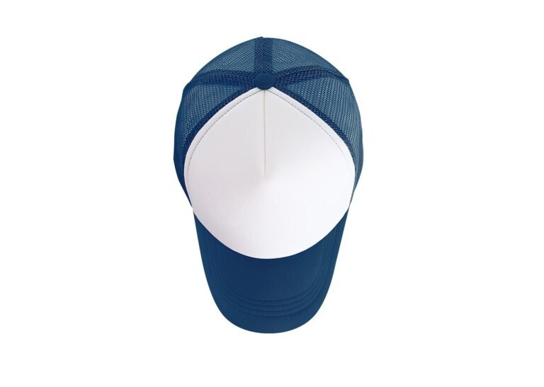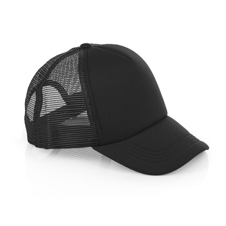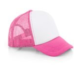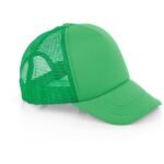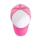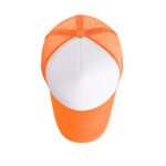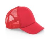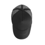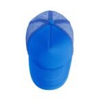 Gorra de 5 paneles con frente fusionado y parte posterior en malla, visera indeformable 4 costuras, botón forrado, tafilete textil y cierre plástico.