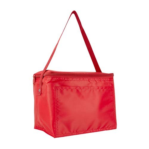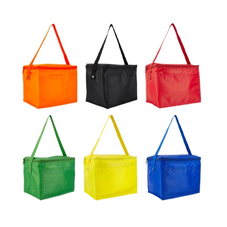 Interior plastificado impermeable. Bolsa principal con cierre y bolsa frontal. Incluye correa. Capacidad para 6 latas.