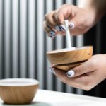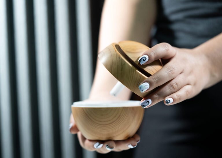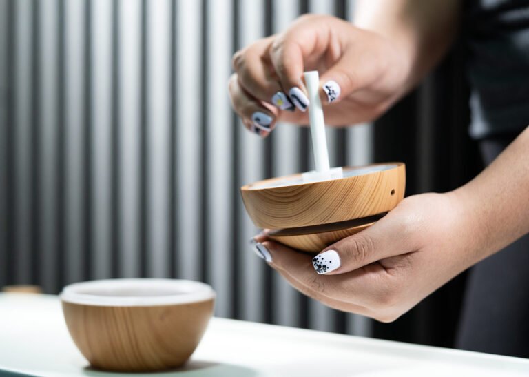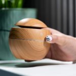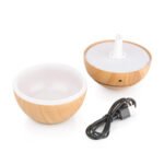 Humidificador de aroma con luz LED, con botón touch para encender y apagar. Se puede usar con aceites esenciales para distintos aromas. Incluye cable USB para cargar.