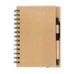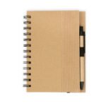 Libreta argollada ‘doble O’ con cubierta dura de cartón y hojas de papel reciclado y banda elástica de cierre. Contiene 70 hojas rayadas de 70 g/m². Tamaño aproximado de la hoja: A6. Incluye bolígrafo ecológico con sistema retráctil.