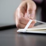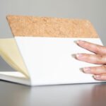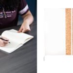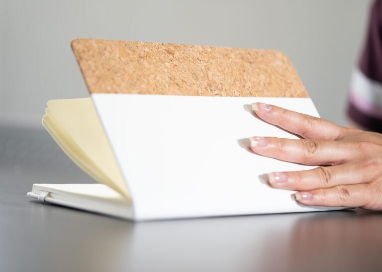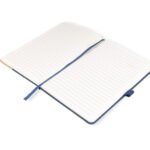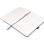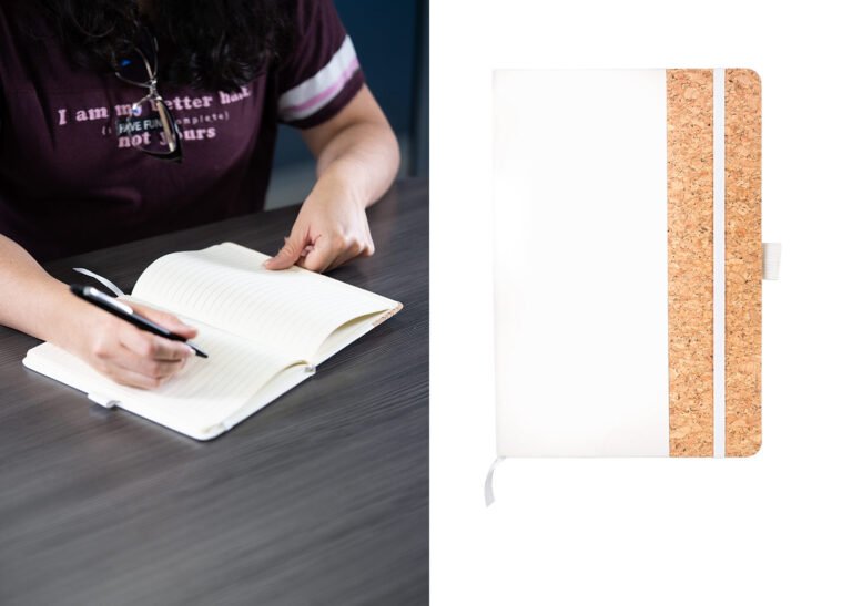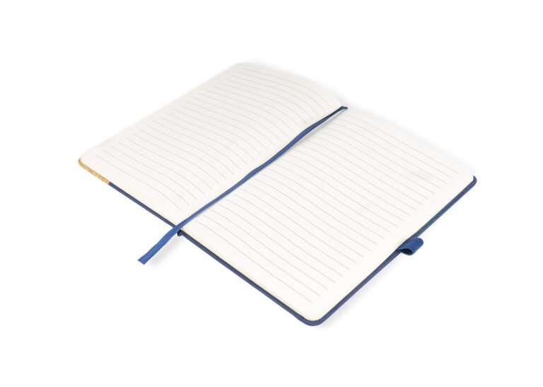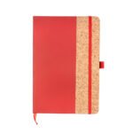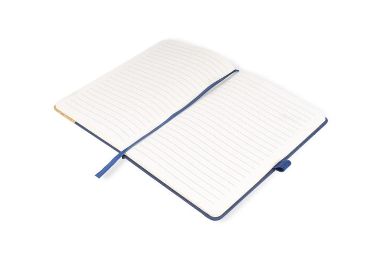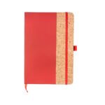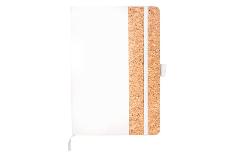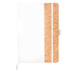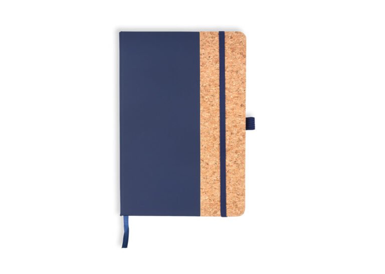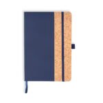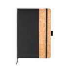 Libreta con cubierta dura forrada en cuero sintético y corcho. Con banda elástica de cierre y una cinta marcadora guia. Contiene 80 hojas rayadas en papel reciclado de 70 g/m². Tamaño aproximado de la hoja: A5.