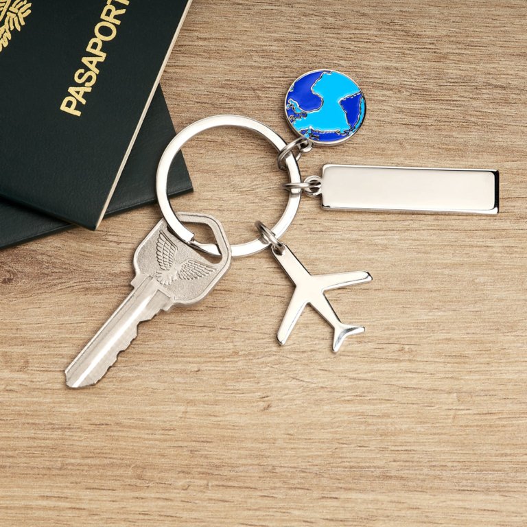 Llavero metalico con una placa para grabado, 1 dije de avion y 1 dije de mundo. Su diseno evoca el espi­ritu aventurero y la pasion por los viajes. Incluye caja individual.