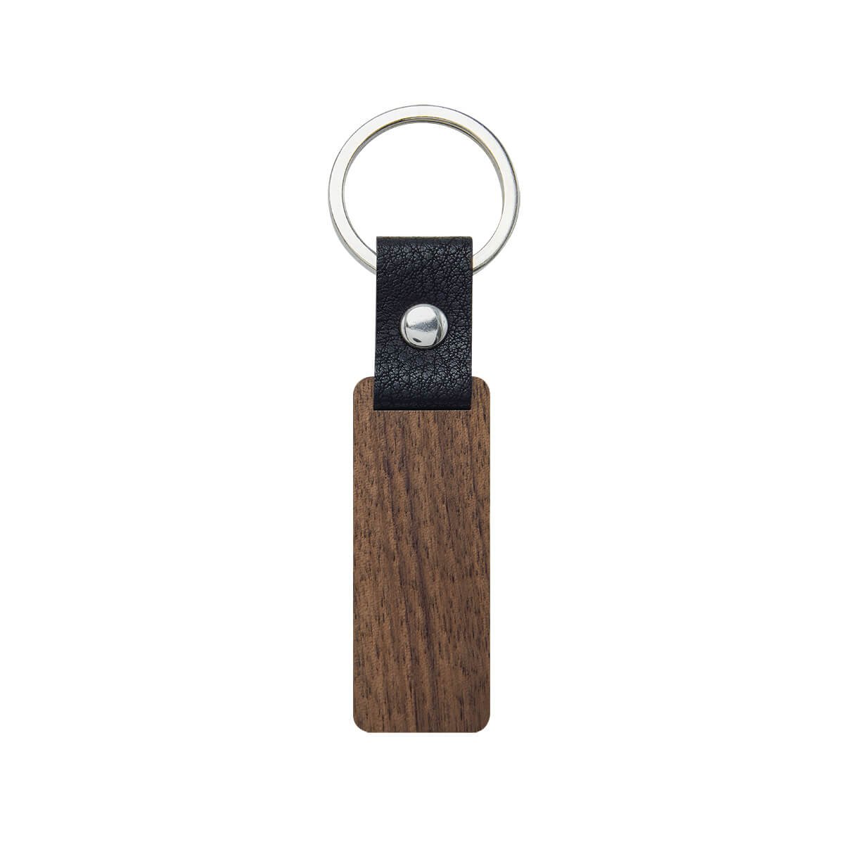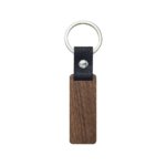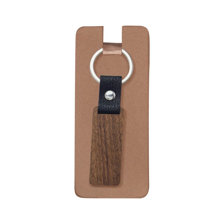 Llavero de madera con tira de curpiel. Incluye empaque con exhibidor de carton y bolsa individual.