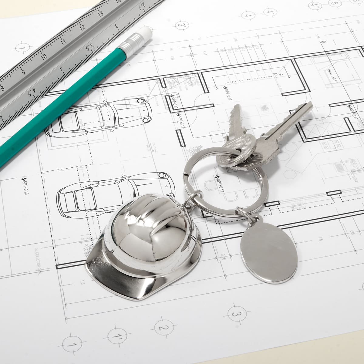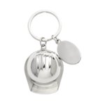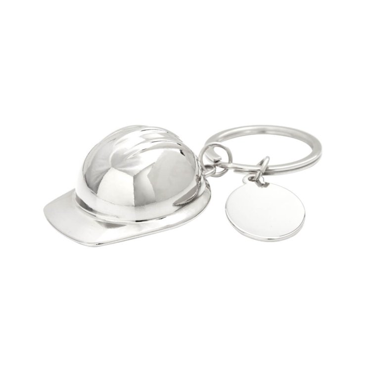 Llavero metalico con diseno en forma de casco. Accesorio perfecto para el sector industrial, construccion y seguridad. Incluye una placa ovalada para personalizar.