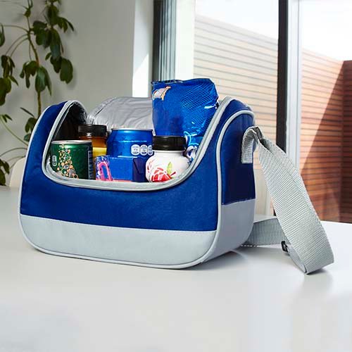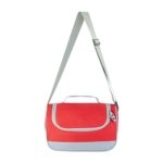 Interior plastificado. Bolsa principal con cierre. Asa de agarre superior y correa ajustable. Capacidad para 6 latas.