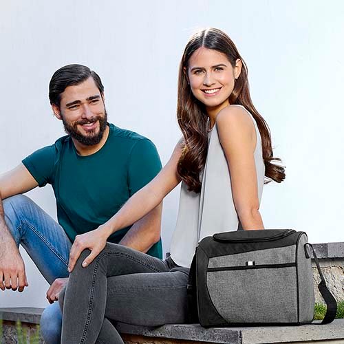 Interior metalizado. Bolsa principal y frontal con cierre. Bolsa lateral de malla y correa ajustable. Capacidad para 16 latas.