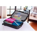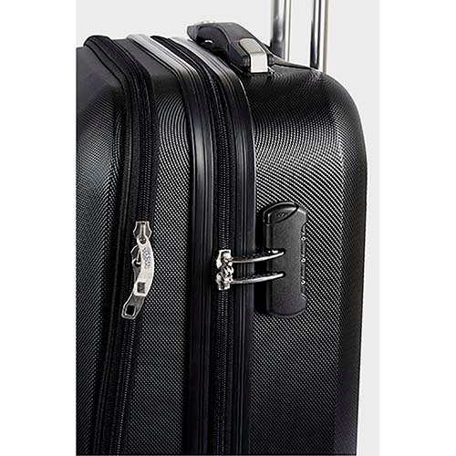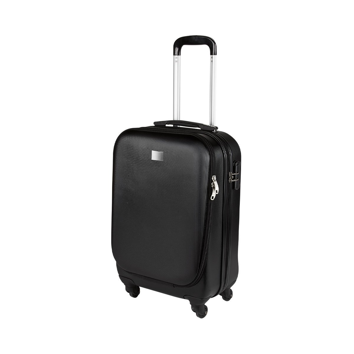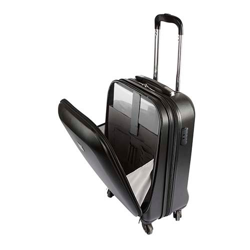 Maleta trolley con 4 ruedas. Cierre frontal con espacio para laptop y organizador de documentos. Cierre principal con 2 compartimentos internos. Placa metalica removible para facil grabado y candado de seguridad con combinacion de 3 digitos. Asa de agarre superior.
