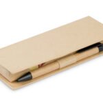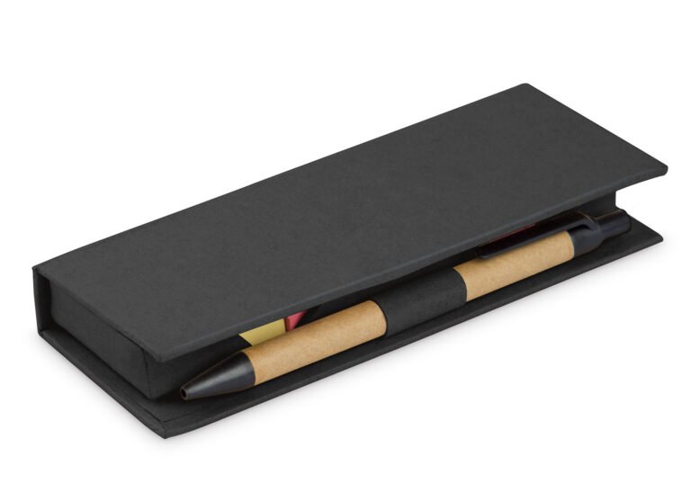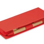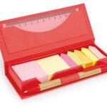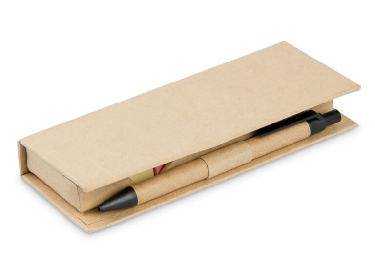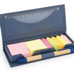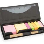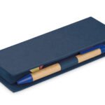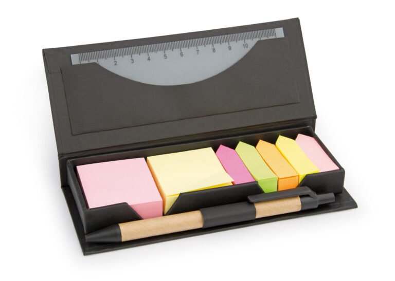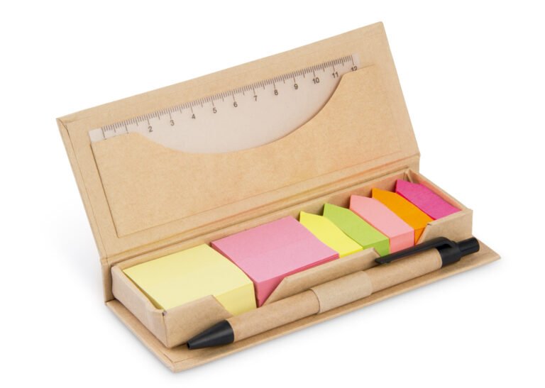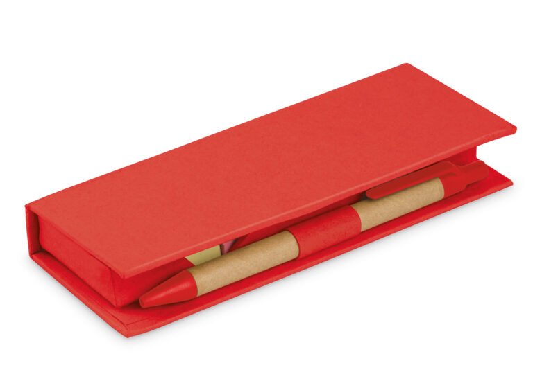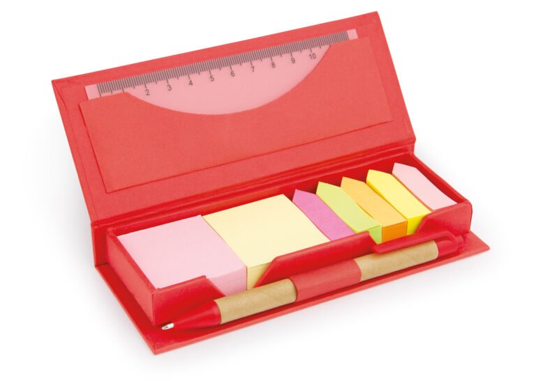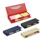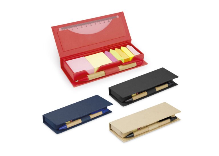 Estuche de cartón con bolsillo para regla de 12 cm, 2 memos de color con 110 hojas c/u y 5 banderas adhesivas en papel de diferentes colores. Incluye bolígrafo ecológico y porta bolígrafo.
