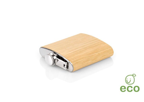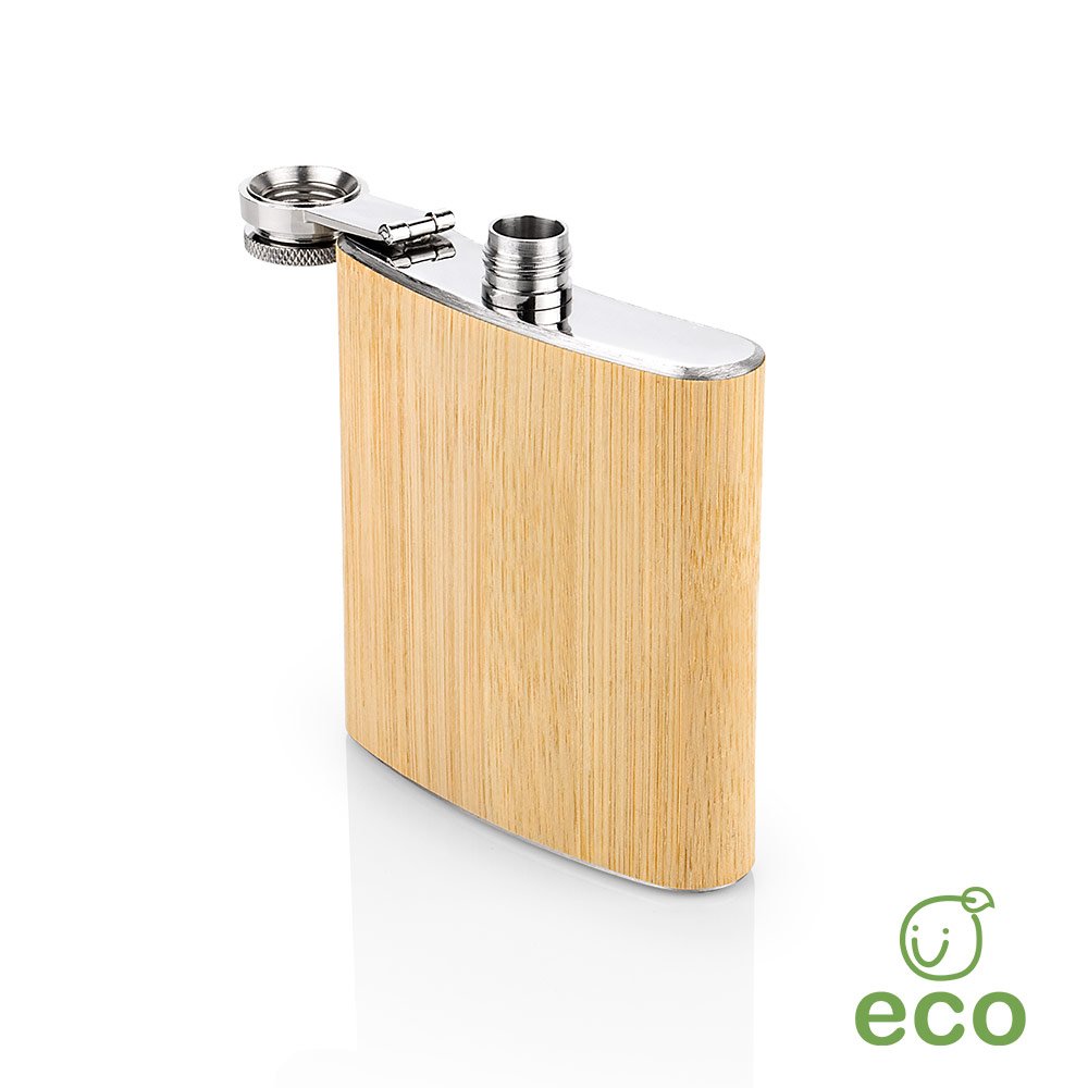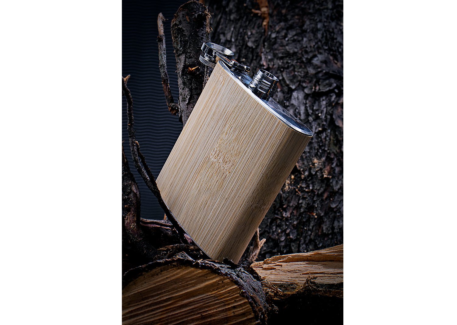 Mini licorera en presentación fácil llevar y tomar su bebida favorita. En acero inoxidable con acabado exterior en Bambú. Capacidad 175ml / 6 Oz.