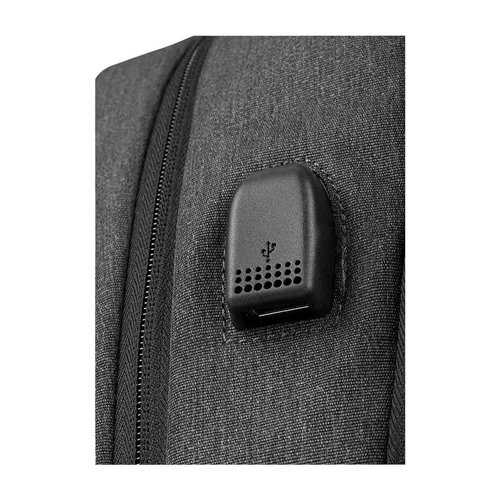 Mochila con salida USB (se requiere conectar a bateria portatil) para cargar smartphone. Compartimento interno para laptop de 14″. Compartimento principal con dos bolsas de red. Bolsa interna con cierre. Bolsa frontal con organizador de documentos. 2 Bolsas laterales con elastico. Bolsa trasera con cierre oculto. Aditamento especial para poner en trolley. Respaldo y tirantes acojinados. Incluye placa metalica para grabado.