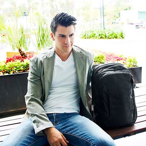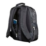 Bolsa principal con cierre y espacio para laptop de 15”. Bolsa central para tablet. Bolsa frontal con compartimentos para celular, boligrafos y documentos. Bolsas laterales con cierre. Respaldo con cierre y porta celular interno. Respaldo y tirantes acojinados. Compartimento inferior con funda impermeable para la mochila. Incluye porta llaves.