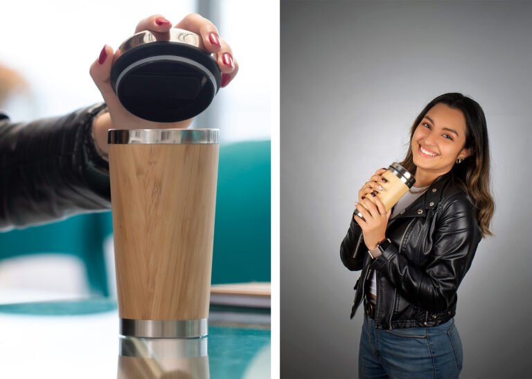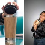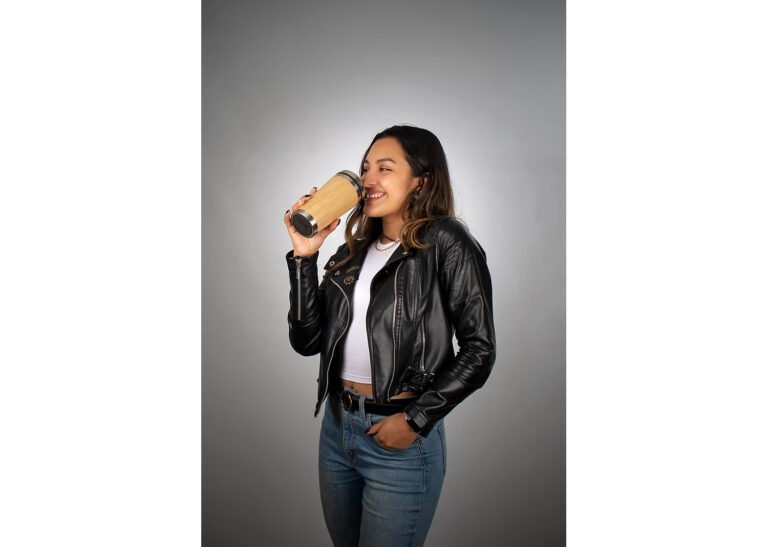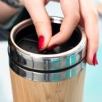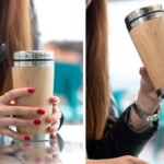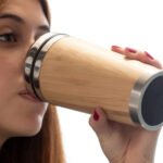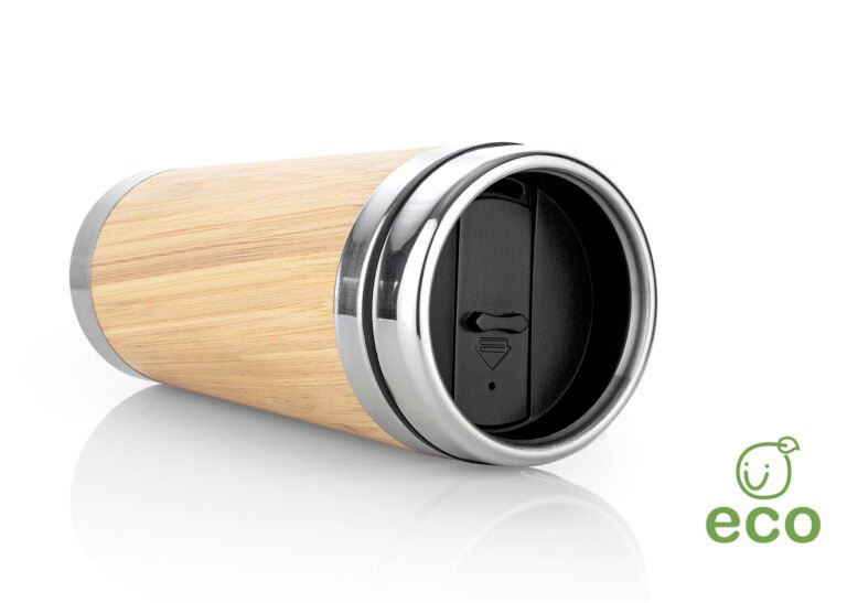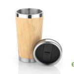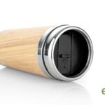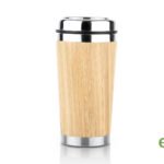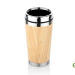 Mug en acero inoxidable y pared externa en Bambú. Con tapa corrediza a presión. Capacidad 450 ml / 15 Oz.