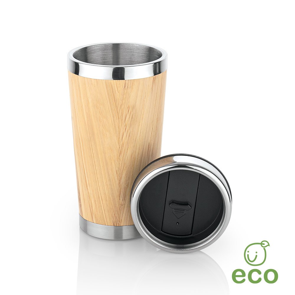 Mug en acero inoxidable y pared externa en Bambú. Con tapa corrediza a presión. Capacidad 450 ml / 15 Oz.