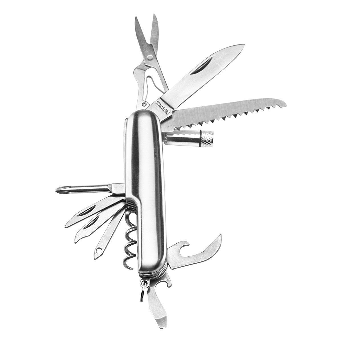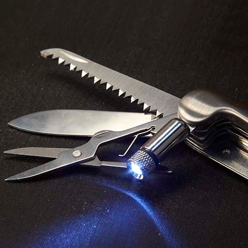 Navaja de bolsillo con 11 funciones. Incluye tijeras, serrucho, sacacorchos, destapador, desarmador con punta de cruz, desarmador con punta plana, navaja grande, 3 navajas chicas, lampara de 1 LED con 3 baterias de boton (incluidas), llavero y funda.