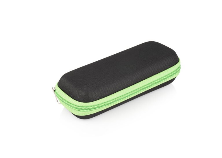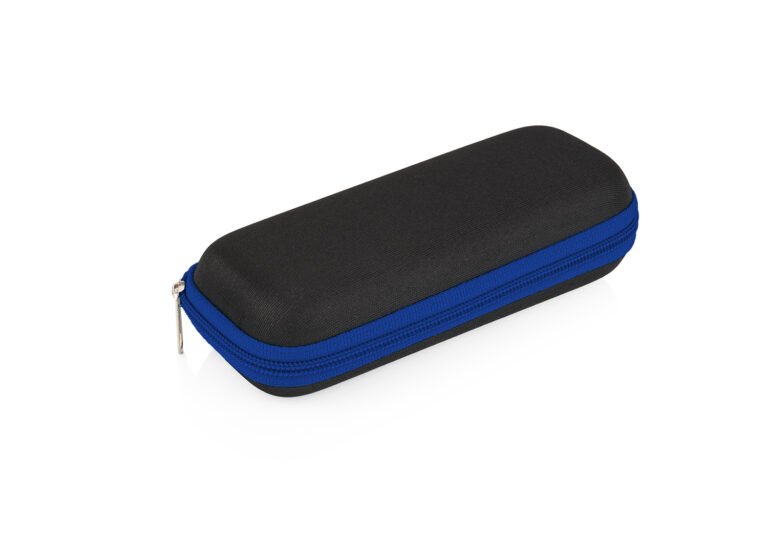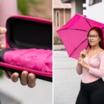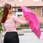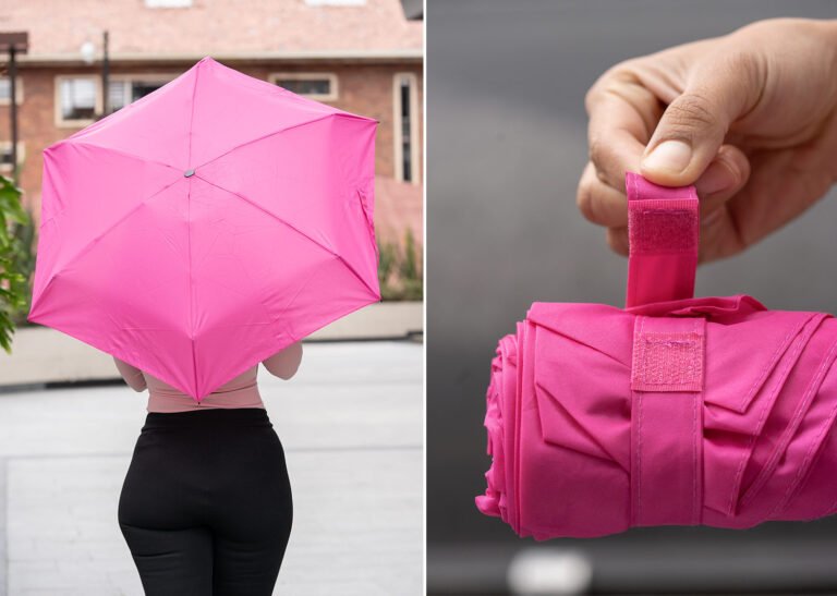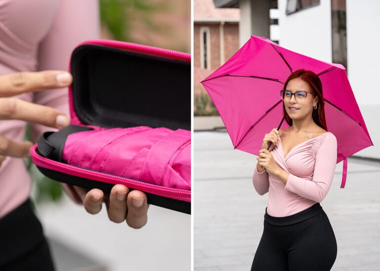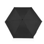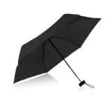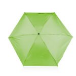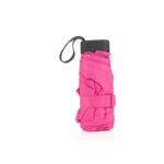 Paraguas mini, perfecto para transportar fácilmente en maletas o bolsos; reversible, de una sección, con apertura y cierre manuales. Marco en fibra de vidrio, de color negro, y mango plástico en juego con el color de la tela. Incluye estuche negro en EVA con cremallera del mismo color del paraguas.