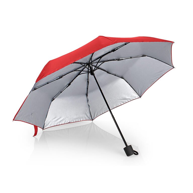 Paraguas 21» con sistema apertura y cierrre manual en 3 secciones, 8 cascos, varillas de fibra de vidrio, manco en acabado de goma, tela de poliéster 190t con recubrimiento interior plateado, incluye funda del color de paraguas.