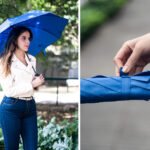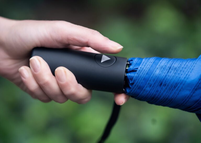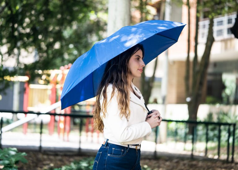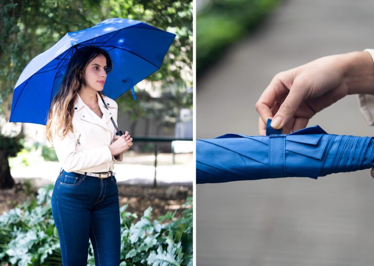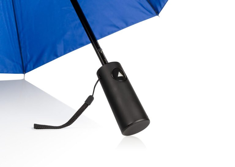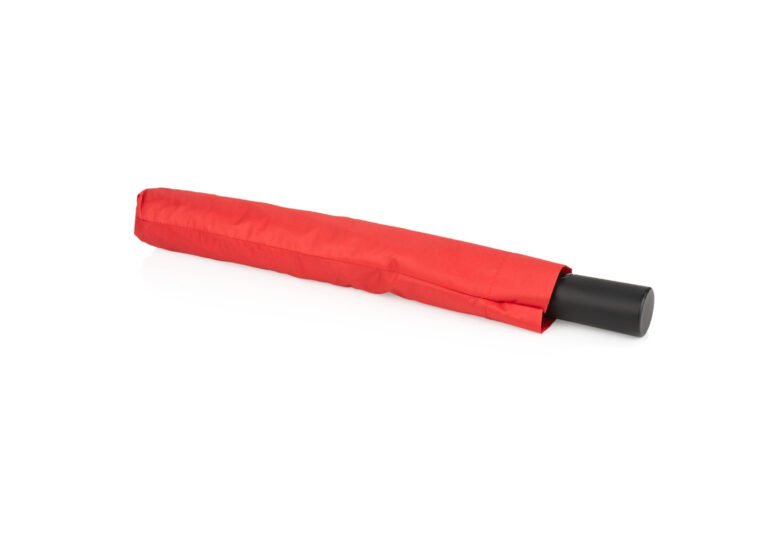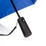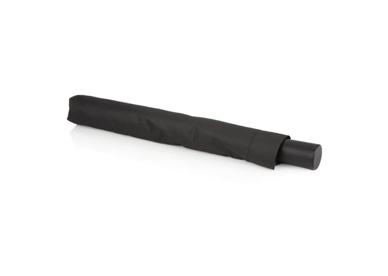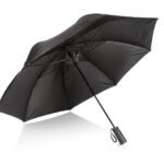 Paraguas de 2 secciones, con apertura automática y cierre manual. Su marco es de metal en color negro. Funda del mismo color que el paraguas.