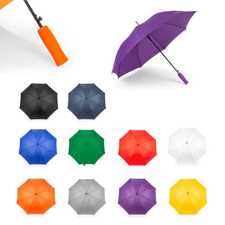 Apertura automática y cierre manual, marco y costillas chapadas. Mango en goma EVA del mismo color del paraguas. Tela pongee 190t, puntas de plástico.