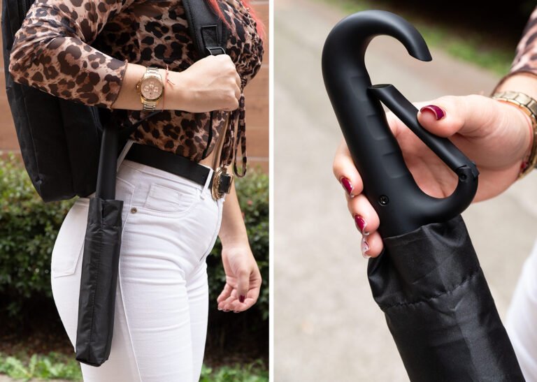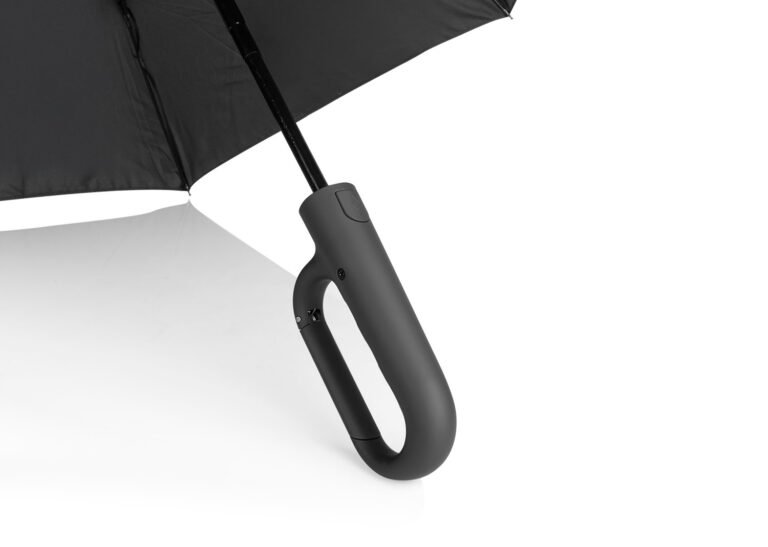 Paraguas de alta calidad confeccionado con tela pongee 190T, resistente al agua y al viento. Agarre ergonómino y sistema de gancho retráctil. Mecanismo de apertura y cierre con botón.