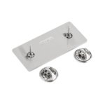 Placa metalica para grabado. Incluye 2 pines de presion. Grosor maximo de encaje 5 mm. Disponible a la venta unicamente en la compra de algun producto textil de catalogo. El precio incluye el grabado de un logo y una posicion. Minimo para grabado de 50 piezas. No aplica grabado personalizado.