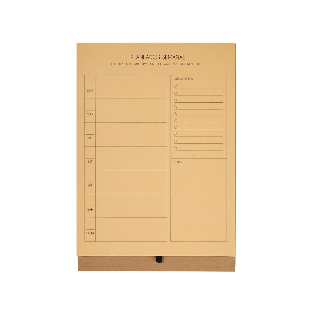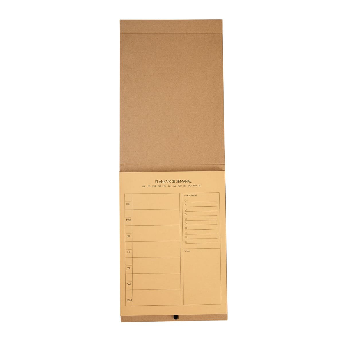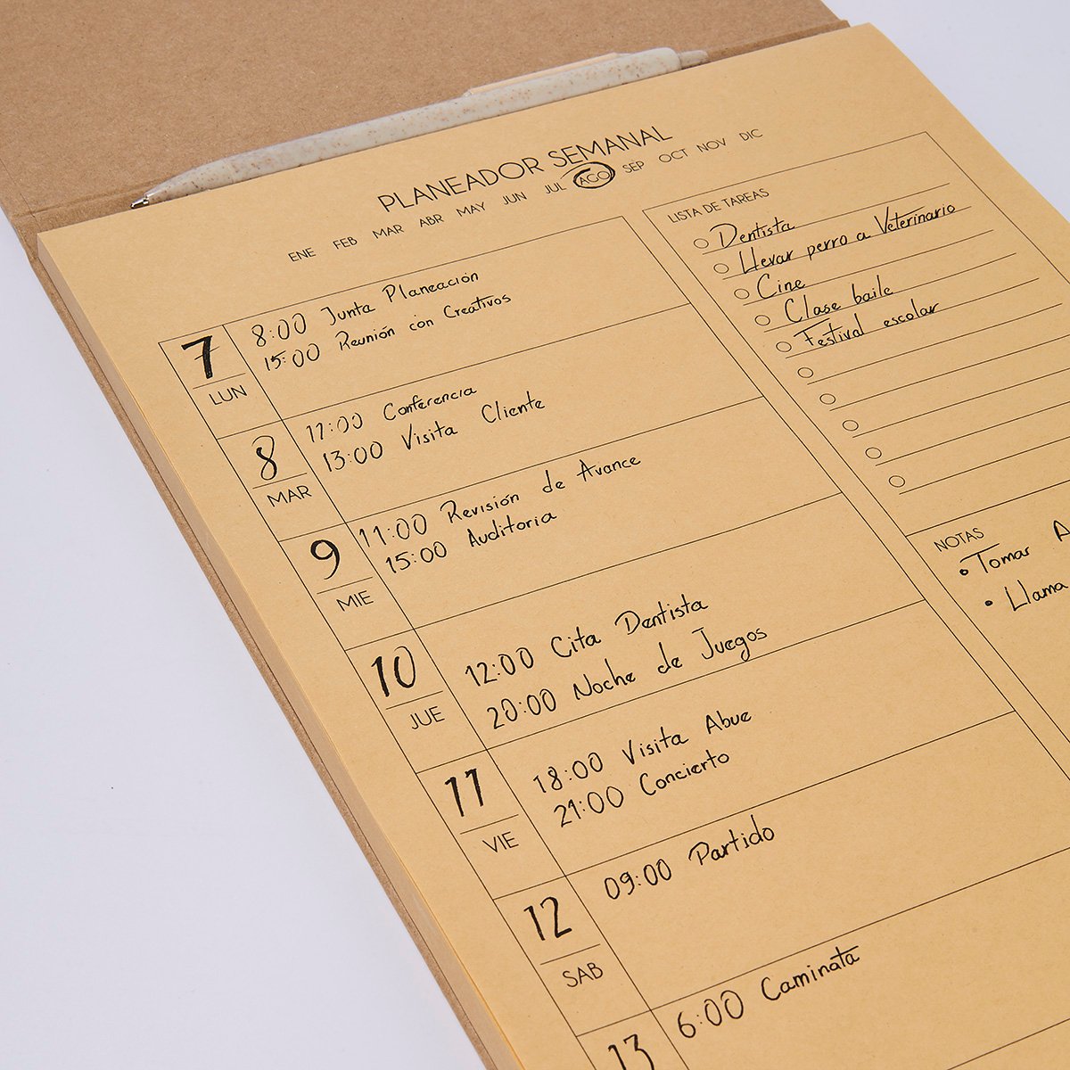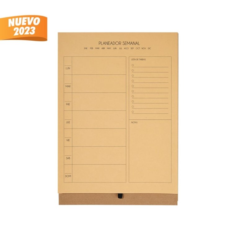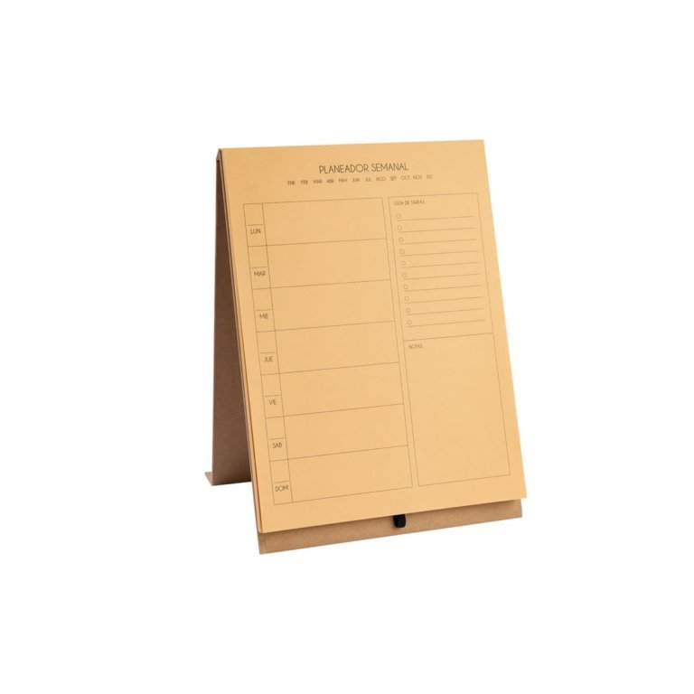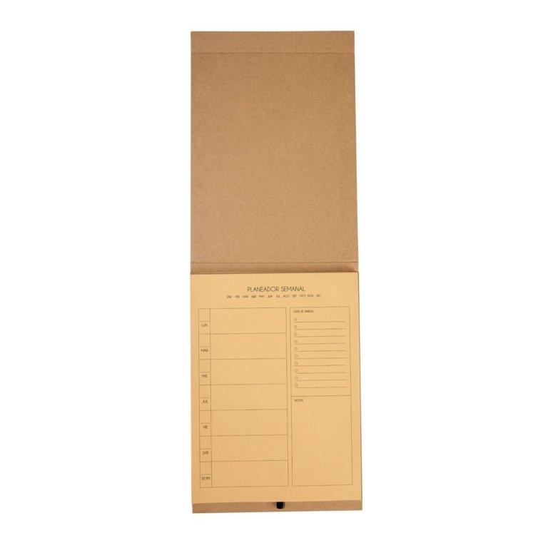 Planeador semanal tamano profesional de pasta dura. Cuenta con 80 hojas ecologicas y elastico para boligrafo (no incluido). Organiza facilmente tus actividades y logra tus objetivos.