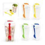 Práctico porta ensaladas. Puede contener hasta cuatro tazas de ensalada. Con tenedor plástico y orificio para encajarlo y pequeño recipiente para aderezo que encaja en la tapa. Porta aderezos 140 ml aproximado.