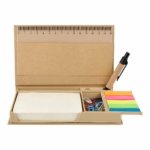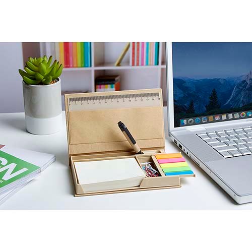 Incluye boligrafo ecologico, porta plumas, regla de 15 cm, clips, 100 notas color beige y banderillas adheribles de 5 colores.
