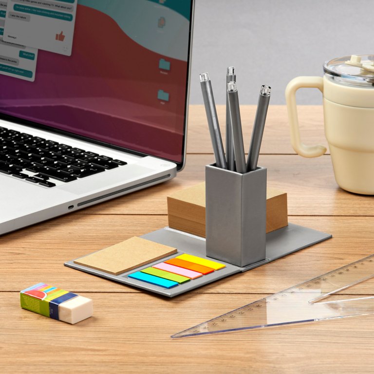 Porta notas plegable con cubierta rigida de carton. Al desplegarlo revela un practico porta lapices. Incluye block de 270 notas y 25 notas adhesivas de papel Kraft, 5 colores diferentes de banderines adhesivos, cada uno con 15 notas. Ideal para mantener tus notas y recordatorios organizados en un solo lugar, perfecto para oficinas y estudiantes.