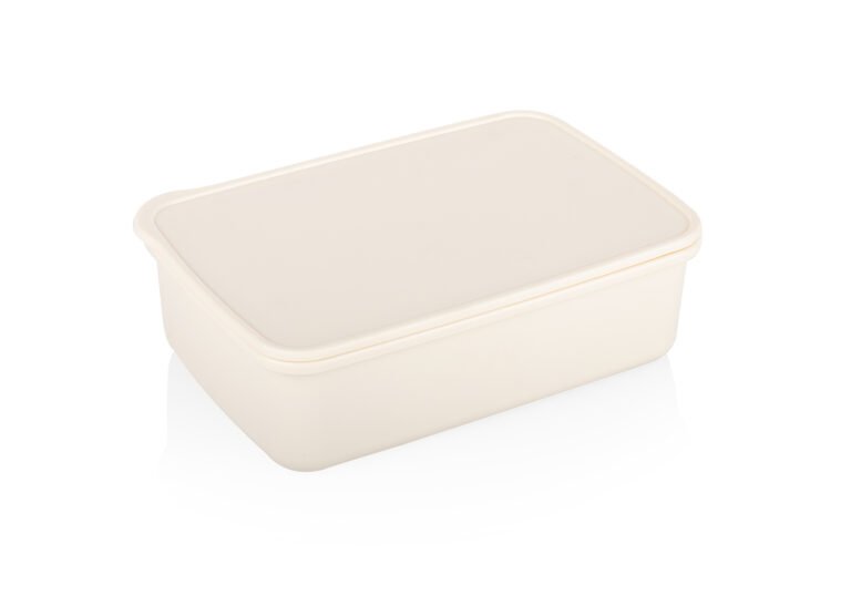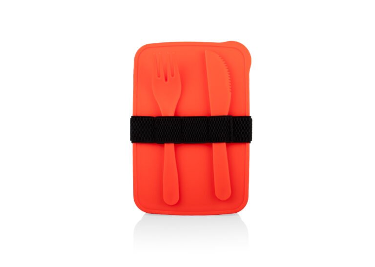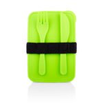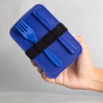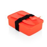 Portacomidas rectangular con banda de seguridad negra. Incluye cuchillo y tenedor.