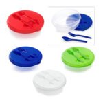 Portacomidas de dos compartimientos. Incluye cubiertos (tenedor y cuchara). Apto para microondas menos los cubiertos. Tener en cuenta que este portacomidas no tiene un cierre hermético.