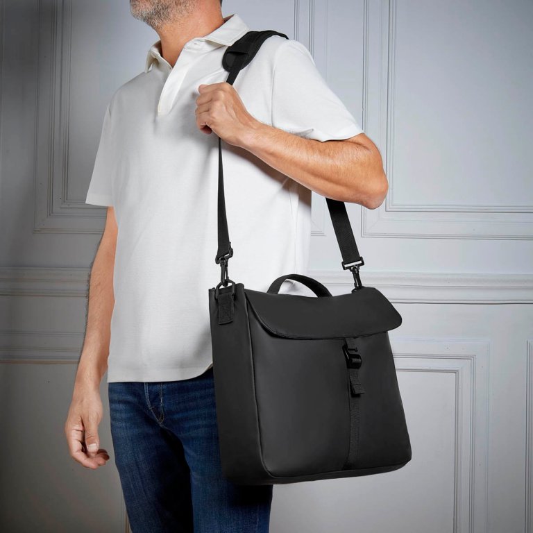 Elegancia y funcionalidad se unen en este portafolio. Con un compartimiento principal seguro, cerrado por un gancho metalico, ofrece espacio para una laptop de hasta 15″. Su asa para hombro con almohadilla integrada, brinda una mayor comodidad al transportarla. Esta mochila es la combinacion perfecta de estilo y practicidad para el profesional moderno.