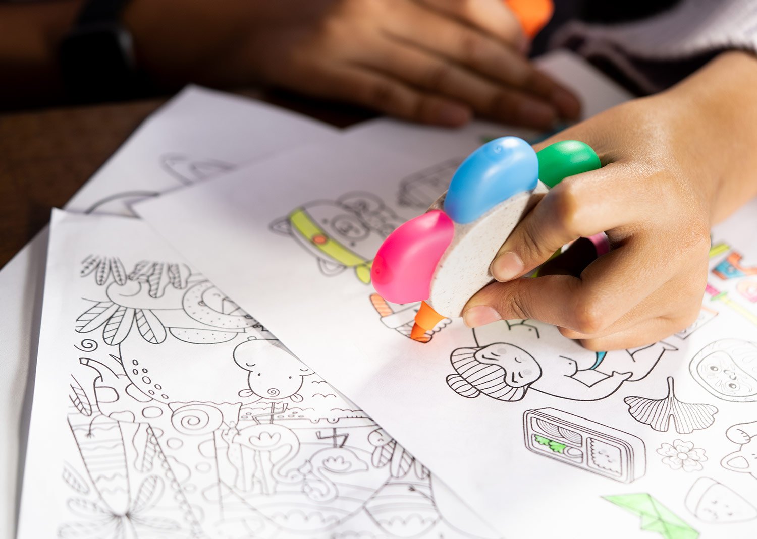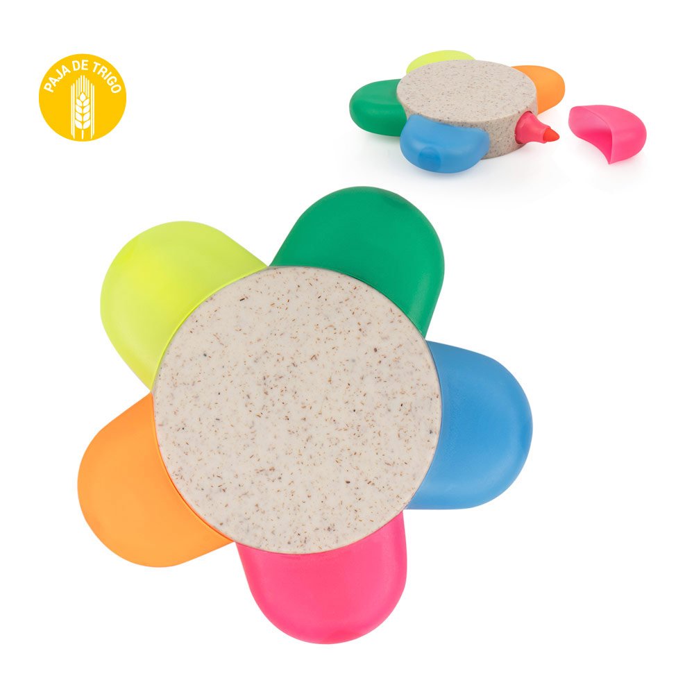 Resaltador con forma de flor, con 5 colores de tinta: azul, rosado, naranja, amarillo y verde. Elaborado con paja de trigo.