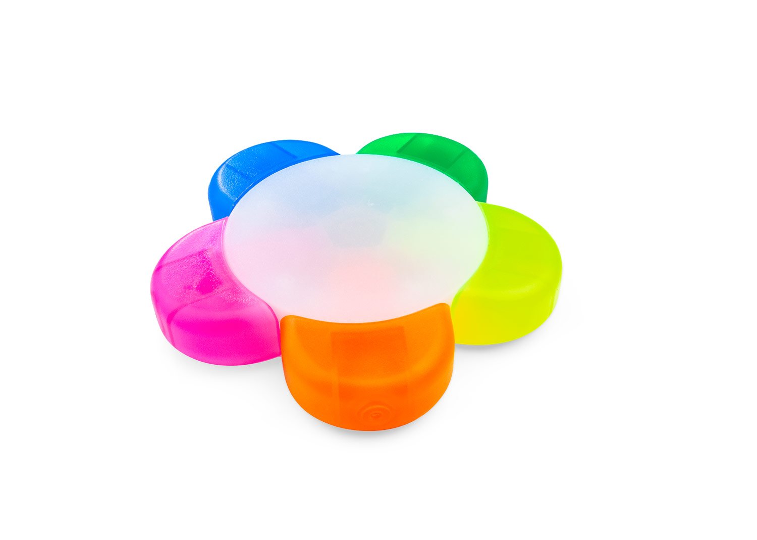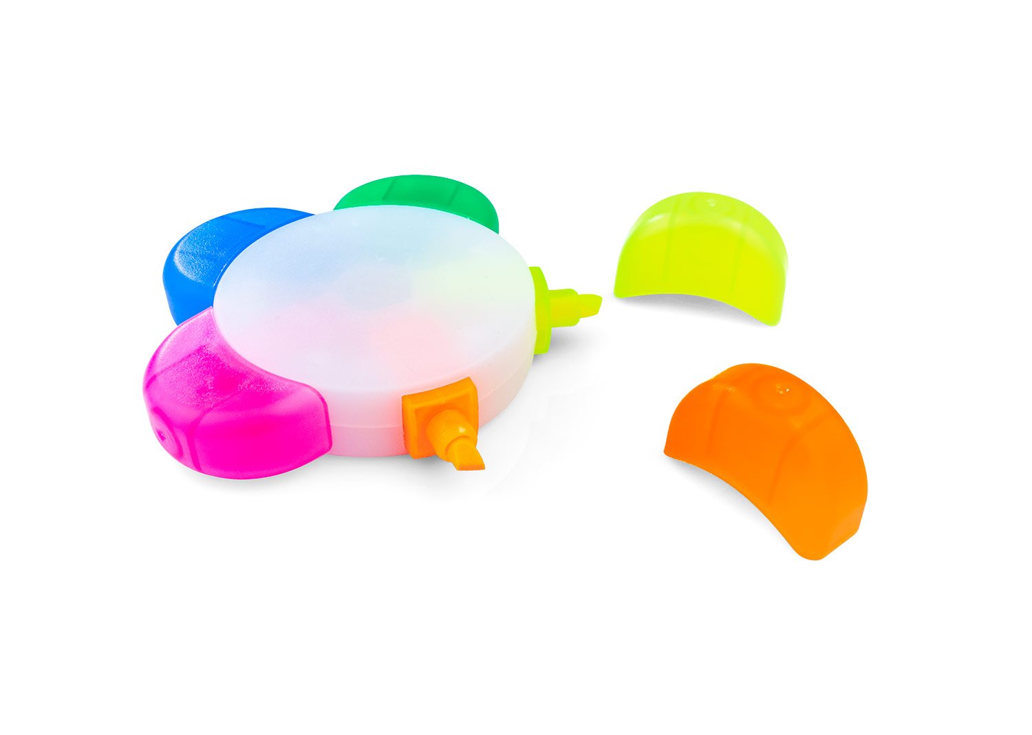Resaltador en forma de flor, con 5 colores de tinta: azul, rosado, naranja, amarillo, verde.