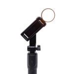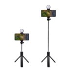 Selfie stick con tripie. Incluye control bluetooth para disparo de fotos via remota (Bateria de boton incluida). Conexion de hasta 10m de distancia. Incluye LED desmontable con luz fria, calida y neutral. El holder gira 360° y el tubo retractil alcanza hasta 68 cm. Incluye cable cargador con conexion micro USB para luz LED.