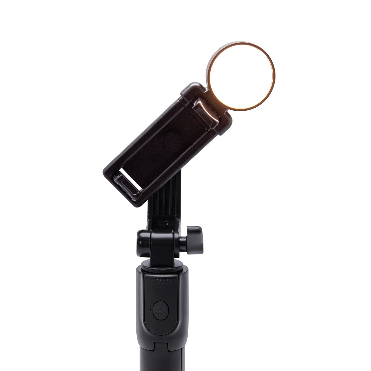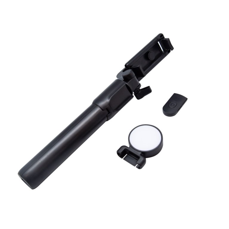 Selfie stick con tripie. Incluye control bluetooth para disparo de fotos via remota (Bateria de boton incluida). Conexion de hasta 10m de distancia. Incluye LED desmontable con luz fria, calida y neutral. El holder gira 360° y el tubo retractil alcanza hasta 68 cm. Incluye cable cargador con conexion micro USB para luz LED.