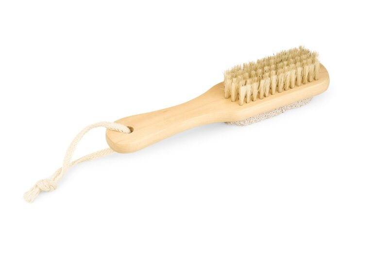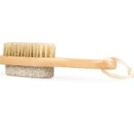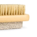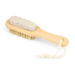 Cepillo 2 en 1 para el cuidado de los pies, que incluye un mango de bambú para manipularlo fácil y comodamente. En la parte frontal tiene una piedra pómez exfoliante y al respaldo, un cepillo para remover y masajear.