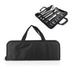 Set BBQ x 16 pcs Incluye: Pala barbacoa, Cuchillo, Tenedor de parrilla, set x 4 brochetas, set x 8 tenedores para maíz y Pinzas de parrilla, con estuche textil, cierre en cremallera y manijas.