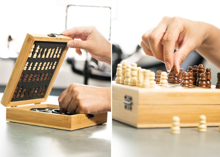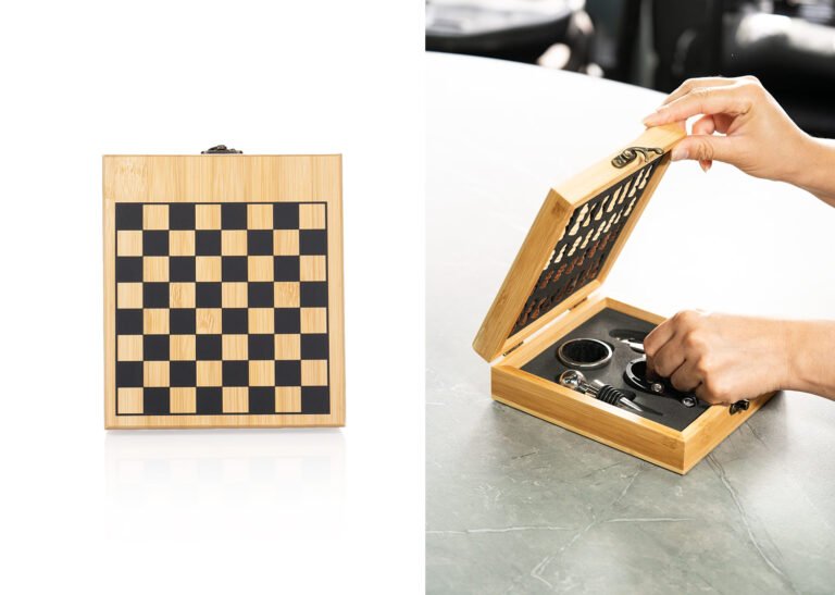 El regalo ideal para los amantes del vino y un excelente complemento para cualquier bar en casa. Un juego de ajedrez moderno para disfrutar en compañía, además de las herramientas necesiarias para disfrutar del vino ya que incluye Cortador de papel aluminio, collar de goteo, tapón de botella y sacacorchos multifunción.