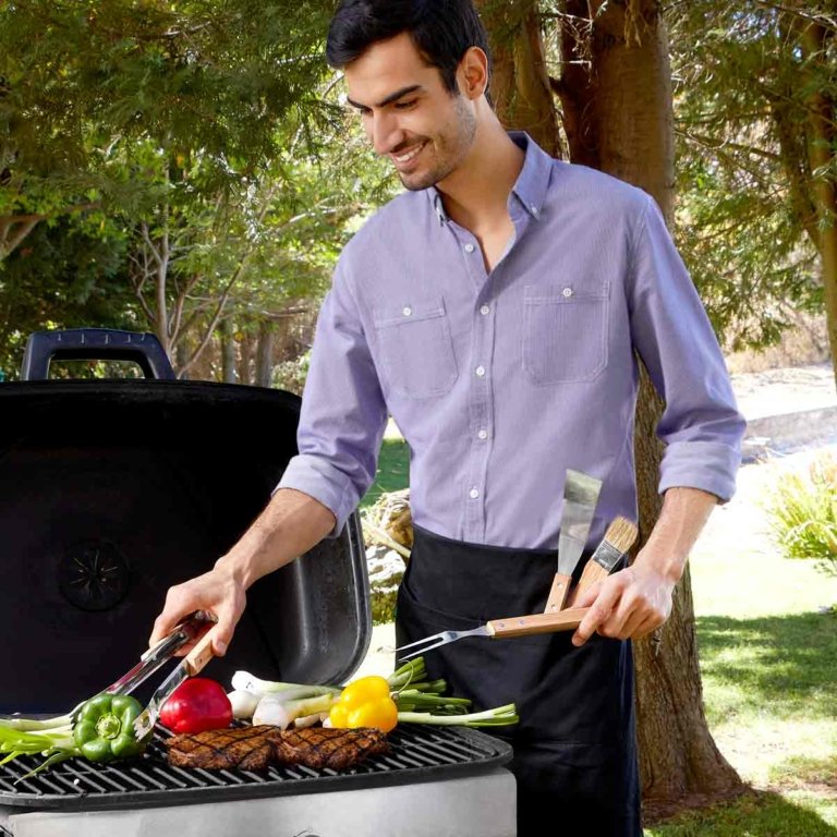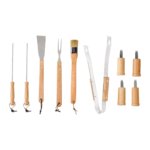 Maletin con cierre y correa ajustable. Incluye pinzas, brocha, tenedor, espatula, 2 brochetas y 4 pinchos para mazorcas.