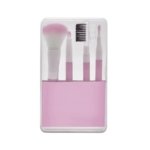 Estuche de plastico con 1 brocha para sombras, 1 brocha para labios, 1 brocha para rubor y 1 peine para cejas y pestanas.