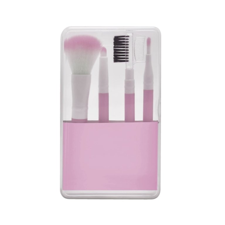 Estuche de plastico con 1 brocha para sombras, 1 brocha para labios, 1 brocha para rubor y 1 peine para cejas y pestanas.