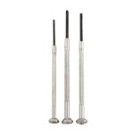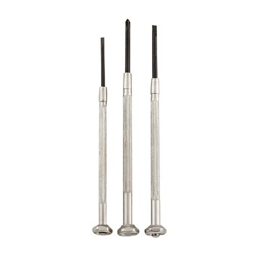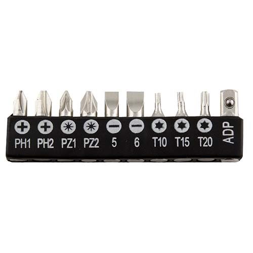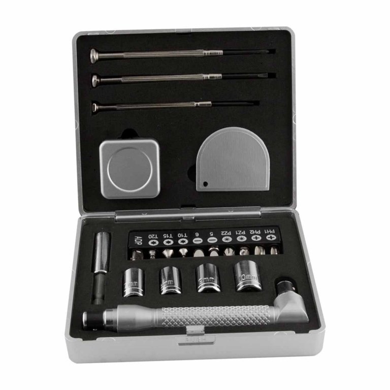 Contiene 3 desarmadores de relojero, flexometro de 1 m, cuter, desarmador con 10 puntas diferentes e intercambiables, dados y extension. Incluye estuche.