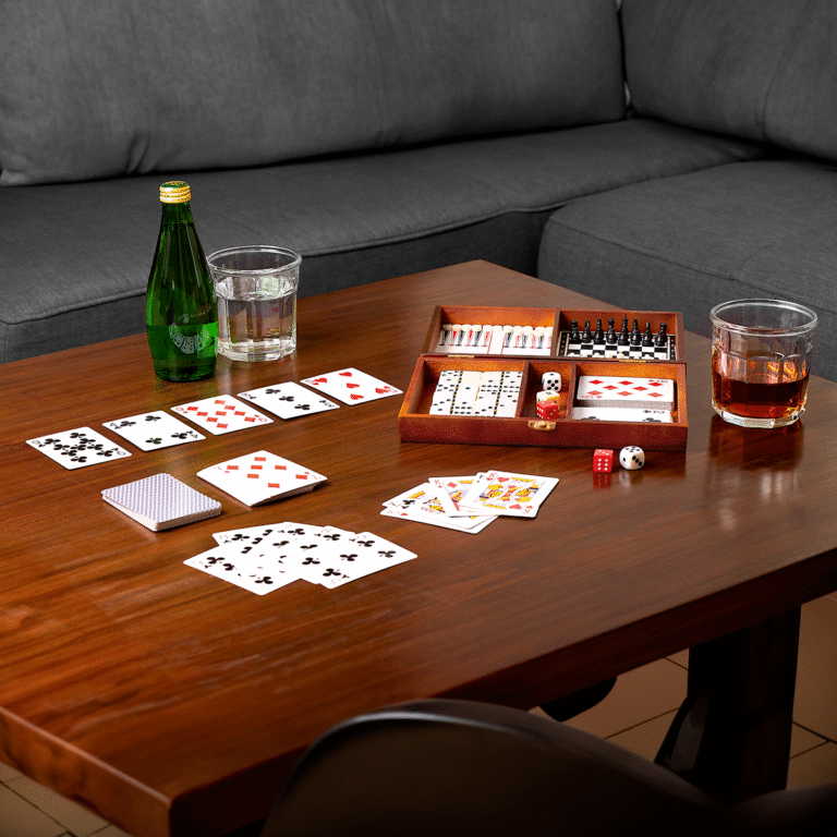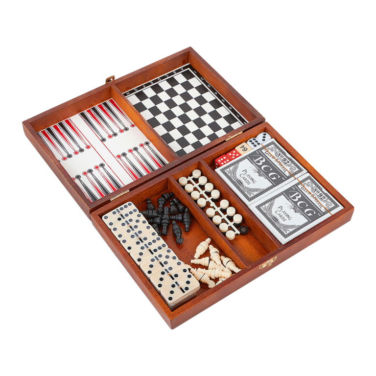 Incluye estuche de madera con juego de ajedrez, backgammon, 2 barajas plastificadas y domino de 28 piezas. La madera es un producto natural el cual puede presentar variaciones en tonalidades y vetas.
